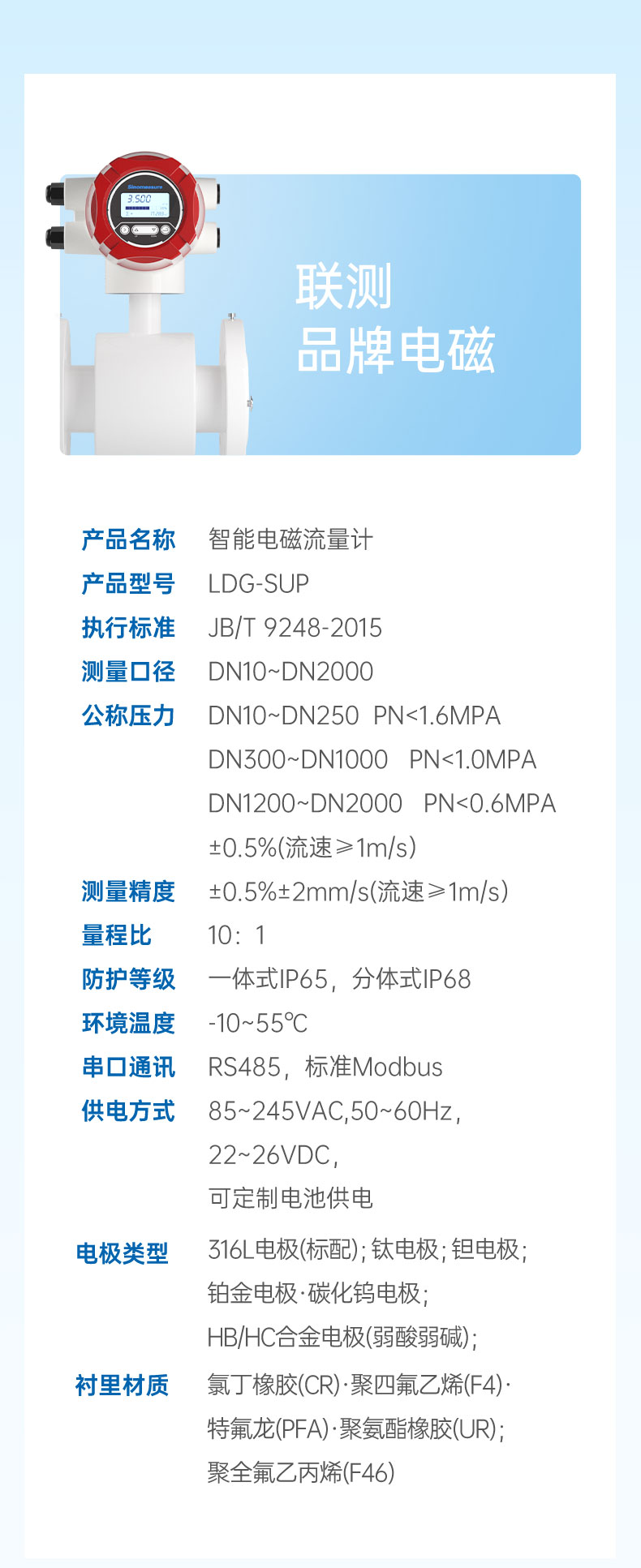 產(chǎn)品描述:聯(lián)測(cè)LDG電磁流量計(jì)適用于化工助劑、海綿城市、給水排水、水利灌溉、水處理、污水處理(環(huán)保污水控制、化工污水、電鍍污水)、造紙漿液(紙漿)、泥漿、醫(yī)藥原料、食品等工農(nóng)業(yè)的生產(chǎn)公司過(guò)程流量測(cè)量和控制,標(biāo)配485通訊功能。