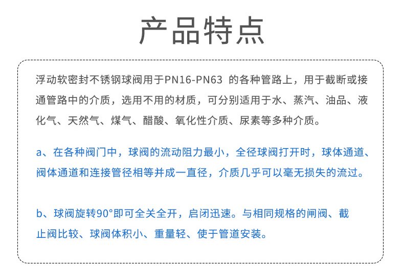產(chǎn)品描述:手動球閥、閥門、閘閥、水閥、控制閥、手動閥,不銹鋼球閥用于PN16-PN63的各種管路上,用于截斷或接通管路中的介質(zhì),選用不用的材質(zhì),可分別適用于水、蒸汽、油品、液化氣、天然氣、煤氣、醋酸、氧化性介質(zhì)、尿素等多種介質(zhì)。咨詢熱線:400-185-1718