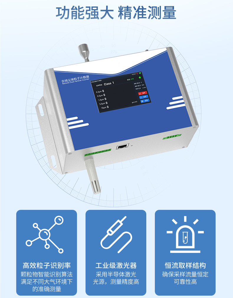 產(chǎn)品描述:這款在線粒子計(jì)數(shù)器采用光學(xué)散射原理,可精確檢測(cè)并計(jì)算單位體積內(nèi)空氣中不同粒徑的懸浮顆粒物的個(gè)數(shù),內(nèi)置獨(dú)特的塵源智能識(shí)別模塊,具有 28.3L/min 大流量的氣體采樣速率,可同時(shí)輸出六個(gè)通道的顆粒數(shù),示值誤差滿足 JJF-1190 標(biāo)準(zhǔn)