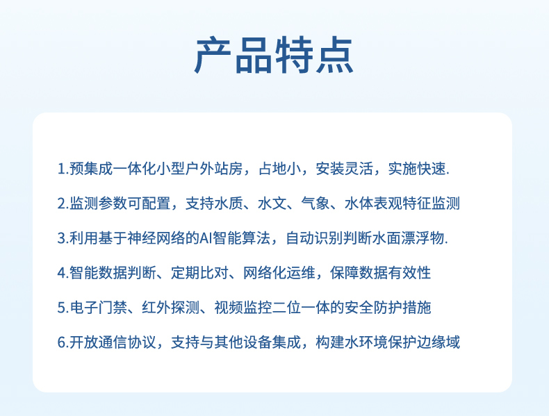 產(chǎn)品描述:為便捷監(jiān)測水環(huán)境,iWater X-Station小型水站采用預(yù)集成一體化小型戶外站房設(shè)計(jì),包括采水系統(tǒng)、預(yù)處理配水系統(tǒng)、分析儀器系統(tǒng)、輔助系統(tǒng)、安防系統(tǒng)、控制與數(shù)據(jù)服務(wù)系統(tǒng)、Al智能分析系統(tǒng)、集成站房等,具有4平方米、8平方米等多種規(guī)格,可實(shí)現(xiàn)水質(zhì)、水文、氣象等參數(shù)的自動測量,以及水面漂浮物的識別,并進(jìn)行結(jié)構(gòu)化、非結(jié)構(gòu)化數(shù)據(jù)的管理與服務(wù)。依據(jù)流域河網(wǎng)水系特點(diǎn),在河道采用iWater X-Station系列小型水站進(jìn)行網(wǎng)格化布點(diǎn)監(jiān)控,結(jié)合信息化技術(shù),以大數(shù)據(jù)支撐水環(huán)境評價(jià)與預(yù)警、水質(zhì)水量科學(xué)調(diào)控,以及治理