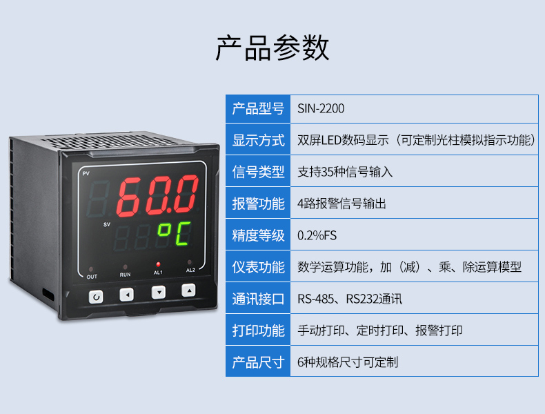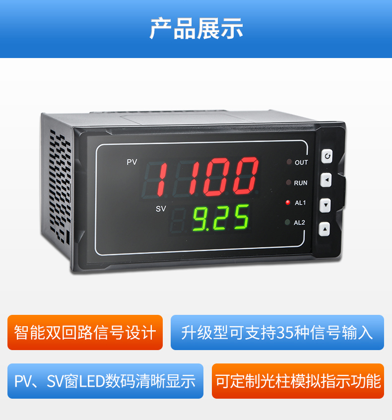 產(chǎn)品描述:SIN-2200雙回路數(shù)字顯示控制儀采用了表面貼裝工藝,全自動貼片機(jī)生產(chǎn),具有很強(qiáng)的抗干擾能力。本儀表支持多種信號類型輸入,可與各類傳感器、變送器配套使用,實現(xiàn)對溫度、壓力、液位、速度、力等物理的測量顯示,帶報警控制、模擬變送輸出、485/232 通訊等輸出功能,帶雙屏數(shù)碼管顯示,可自由設(shè)定上、下窗口顯示內(nèi)容,可訂制數(shù)學(xué)運(yùn)算功能,可針對兩路測量信號進(jìn)行加、減、乘、除運(yùn)算,其適用范圍非常廣泛。