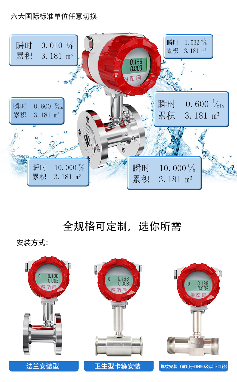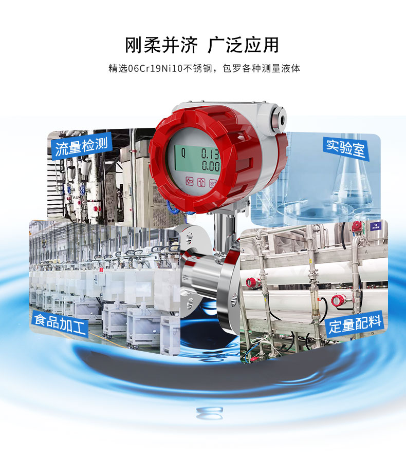 產(chǎn)品描述:液體渦輪流量計(jì)基于力矩平衡原理,屬于速度式流量?jī)x表。它具有準(zhǔn)確度高、重復(fù)性好、結(jié)構(gòu)簡(jiǎn)單、壓力損失小、維修方便等優(yōu)點(diǎn),于測(cè)量封閉管道中低粘度液體的體積流量。在石油、化工、冶金、供水、造紙等行業(yè)中具有廣泛的應(yīng)用。