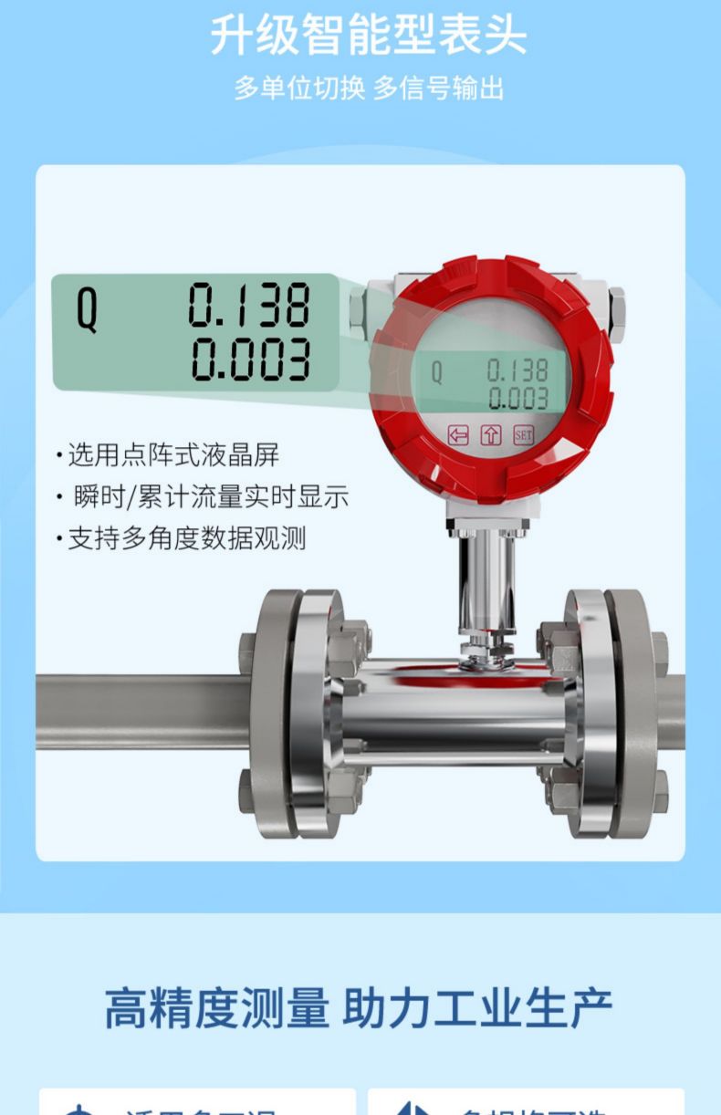 產(chǎn)品描述:液體渦輪流量計(jì)基于力矩平衡原理,屬于速度式流量?jī)x表。它具有準(zhǔn)確度高、重復(fù)性好、結(jié)構(gòu)簡(jiǎn)單、壓力損失小、維修方便等優(yōu)點(diǎn),于測(cè)量封閉管道中低粘度液體的體積流量。在石油、化工、冶金、供水、造紙等行業(yè)中具有廣泛的應(yīng)用。
