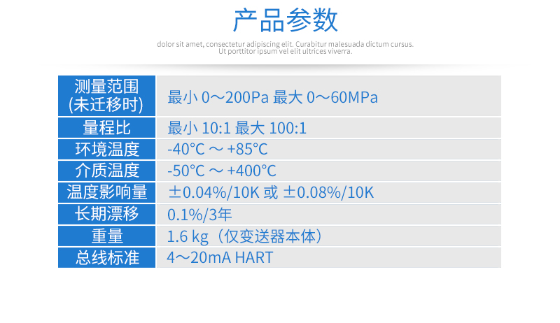 產(chǎn)品描述:智能差壓變送器是用世界先進的單晶硅壓力傳感器技術(shù)與專利封裝工藝,精心研制出的一款國際領(lǐng)先技術(shù)的高性能壓力變送器。