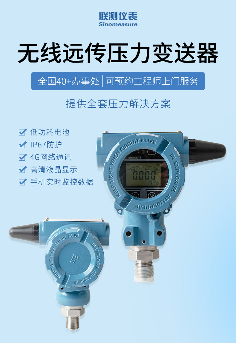 產(chǎn)品描述: 無線壓力變送器是基于 4G 無線通訊網(wǎng)絡(luò)使壓力的測(cè)量、變送、上報(bào)為一體的低功耗智能儀表。產(chǎn)品集成高靈敏度壓力檢測(cè)元件,高精度信號(hào)調(diào)理電路,低功耗電池電源管理,豐富的 LCD 顯示界面于一體,周期性上報(bào)壓力測(cè)量值、電池電量、信號(hào)質(zhì)量等數(shù)據(jù),并且能夠在壓力超出設(shè)置范圍時(shí)及時(shí)報(bào)警,提前預(yù)警故障隱患。