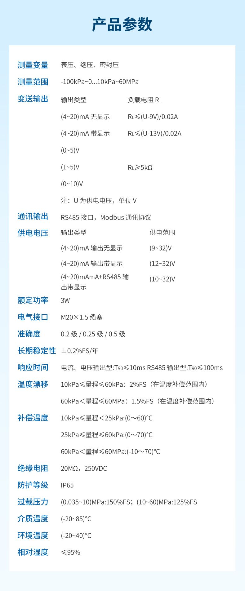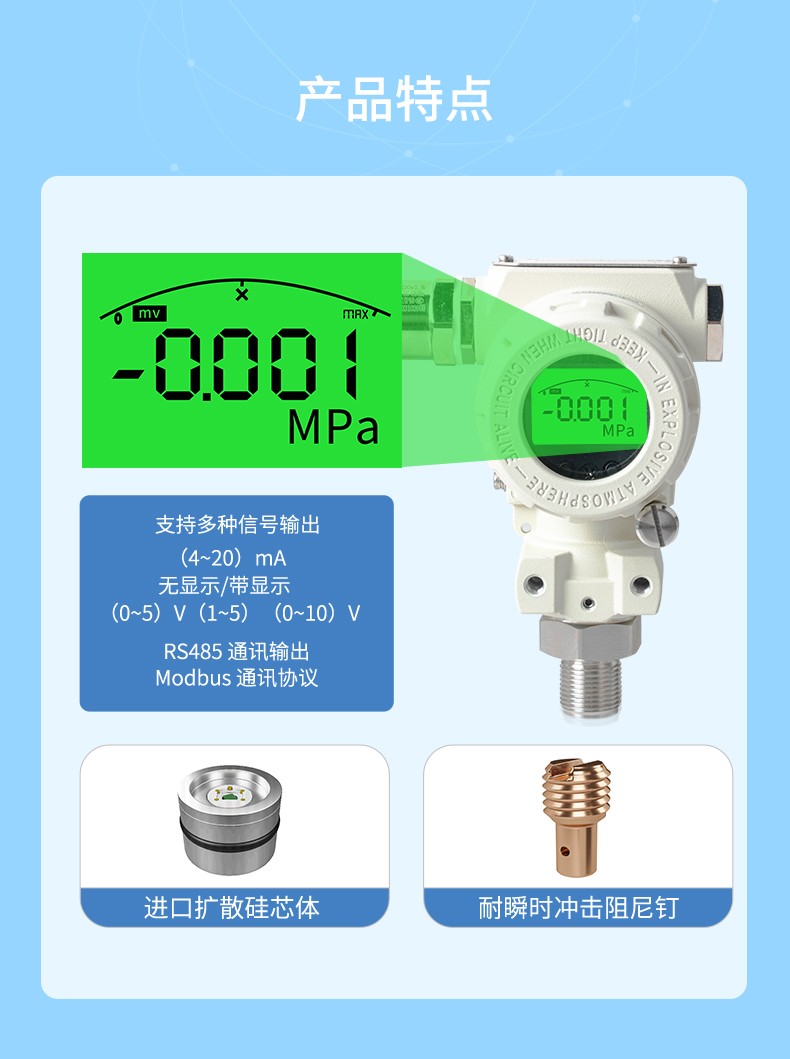 產(chǎn)品描述: 壓力變送器選用進口高精度、高穩(wěn)定性的擴散硅芯體,傳感器內(nèi)采用電子放大器組成,將測量的電信號轉(zhuǎn)換成標準信號(電流、電壓、RS485)輸出??梢灾苯优c計算機接口卡、控制儀表、智能儀表或 PLC 等方便相連。