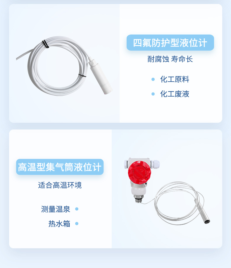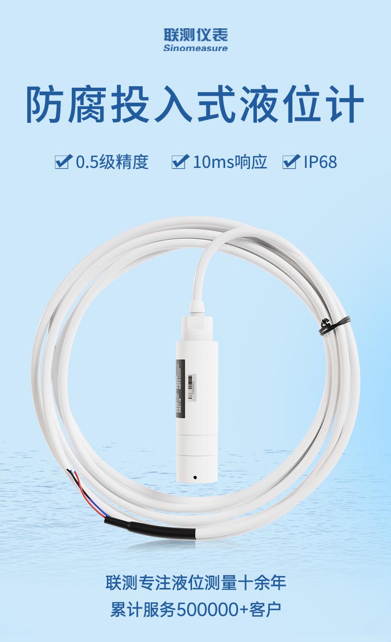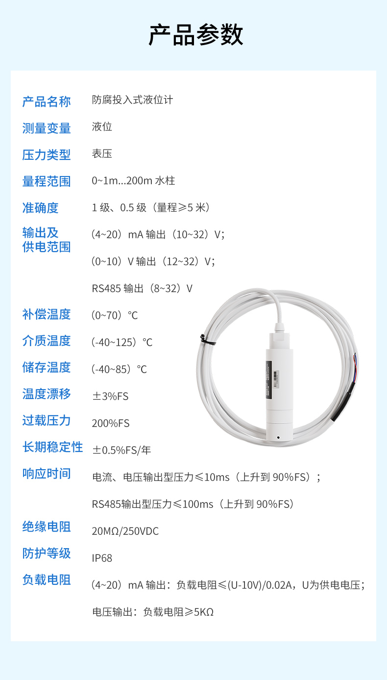 產(chǎn)品描述:防腐投入式液位變送器由高性能陶瓷壓力傳感器作為測量元件,把與液位深度成正比的液體靜壓力準確的測量出來,并經(jīng)過信號調理電路轉換成標準的電流、電壓或 RS485 信號輸出,建立起輸出信號與液位深度的線性對應關系,實現(xiàn)對液體深度的測量。產(chǎn)品采用聚四氟乙烯防腐材質,具有優(yōu)良的耐腐蝕性能,廣泛適用于化工廠酸、堿性等腐蝕介質的液位測量。