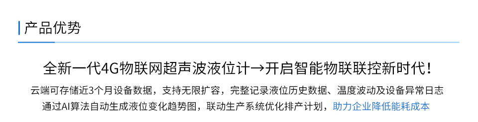 產(chǎn)品描述:WSU-200 4G物聯(lián)超聲波液位計(jì)具有高可靠性、高性價(jià)比、易安裝維護(hù)的液位/物位測(cè)量?jī)x器,可廣泛用于各種液體和固體物料高度的測(cè)量。本產(chǎn)品可選配 NB-IoT 無(wú)線通訊功能,用戶可在儀表云平臺(tái)進(jìn)行數(shù)據(jù)查看和遠(yuǎn)程監(jiān)控。常見(jiàn)的應(yīng)用工況,如市政、化工、儲(chǔ)運(yùn)等工業(yè)環(huán)境中的河流、水池、儲(chǔ)罐等液位測(cè)量。咨詢熱線:400-185-1718