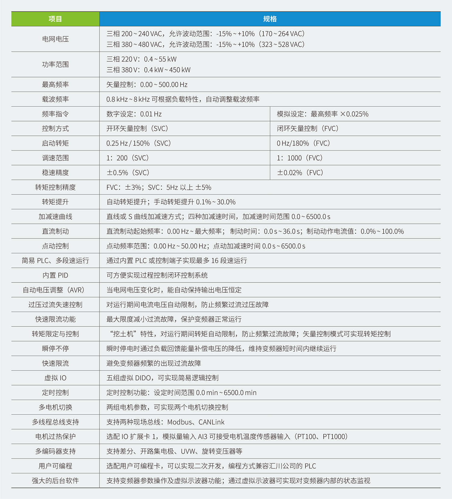 MD500E 系列變頻器是一款通用高性能電流矢量變頻器,主要用于控制和調節三相交流同步電機的速度和轉矩,是MD380E 系列的技術升級產品。MD500E 采用高性能的矢量控制技術,低速高轉矩輸出,具有良好的動態特性、超強的過載能力、增加了用戶可編程功能及后臺監控軟件,通訊總線功能,支持多種PG 卡等,組合功能豐富強大,性能穩定。